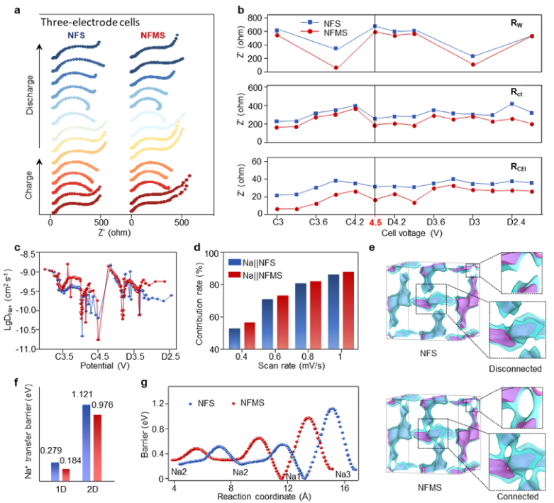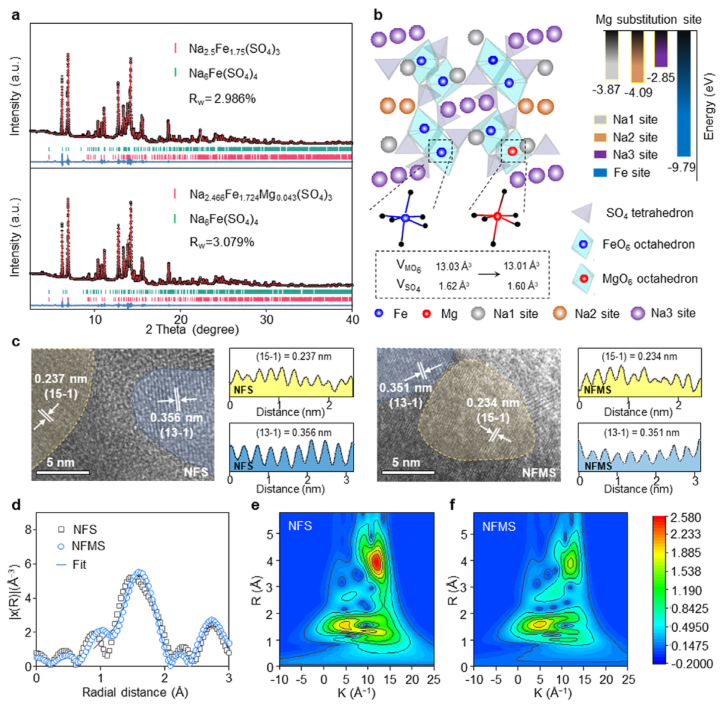 研究发现,MgO6八面体的强共价键作用优化了钠离子传输通道,大幅提升离子电导率;同时,镁离子掺杂降低了材料表面氧原子的电子密度,有效抑制了与空气水分及电解液中酯类分子的副反应,增强了化学稳定性。