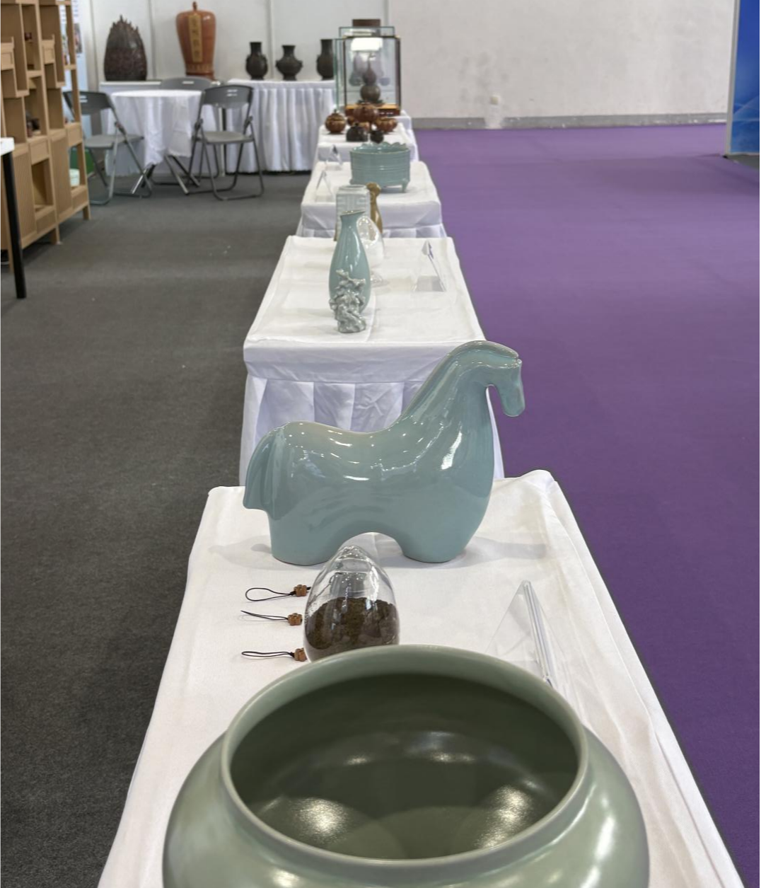 平顶山汝瓷与钦州坭兴陶均为中国陶瓷艺术的杰出代表。汝瓷釉色天青、器形典雅,素有“青如天,面如玉,蝉翼纹,晨星稀”之美誉,为宋代五大名瓷之首;坭兴陶则以钦江陶泥为胎,雕工精湛、窑变无双,享有“窑宝”“中国一绝”的美誉。两者跨越地域与时代,在此次博览会中实现一场千年传统的匠心对话。