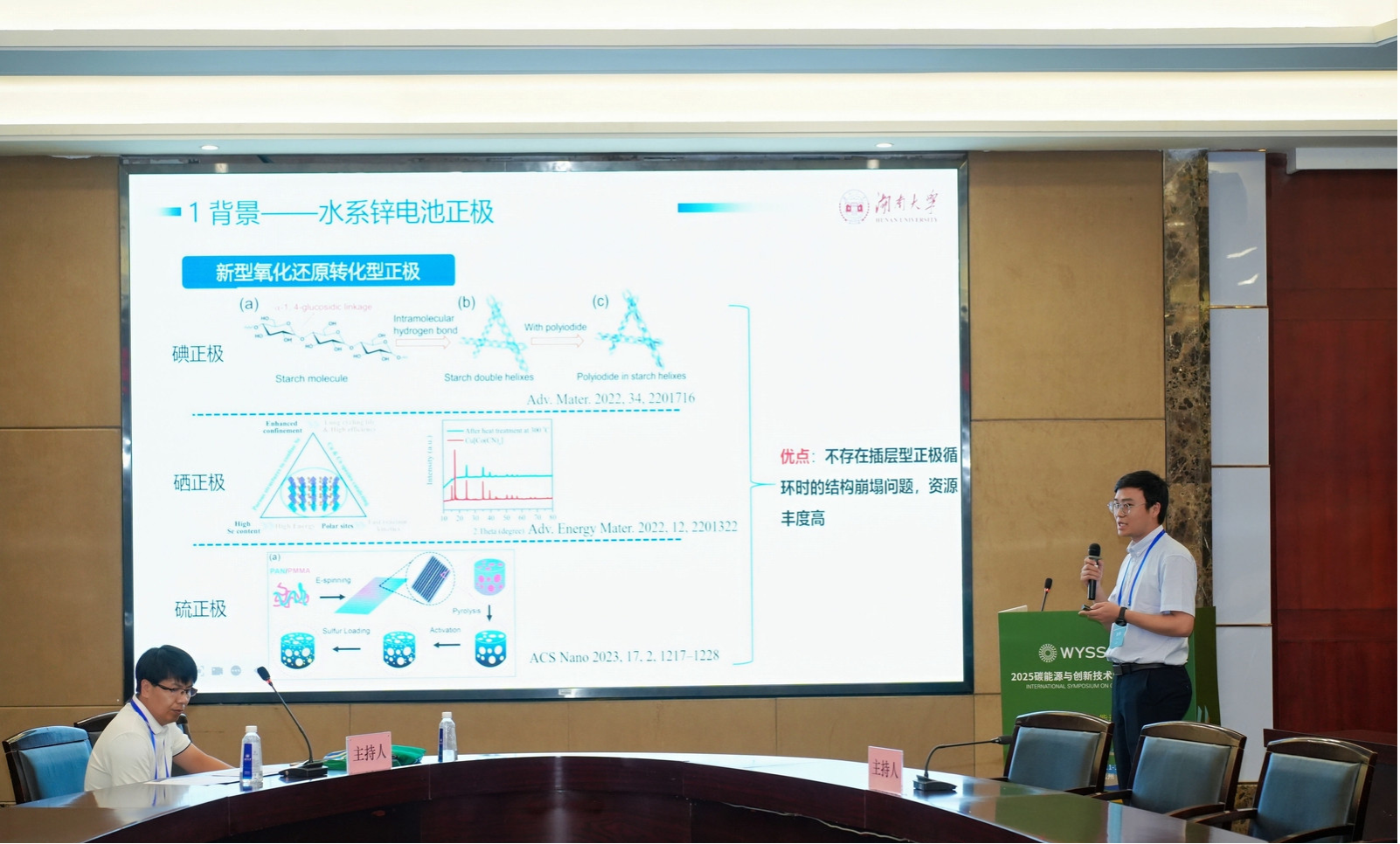 尧山实验室青年博士屈文涛在大会上作题为《水系锌电池的碳基电极研究》的主题报告,报告内容包括通过原子级催化设计同步解决碘穿梭效应与反应动力学难题;通过原位剥离策略构建高吡啶氮/羰基双活性位点电极以及通过沉积控制技术引导锌离子渐进沉积,实现无枝晶镀锌。此外,通过本次大会向大家重点介绍了尧山实验室发展现状,并热烈欢迎广大科研学者加入和学术交流合作。